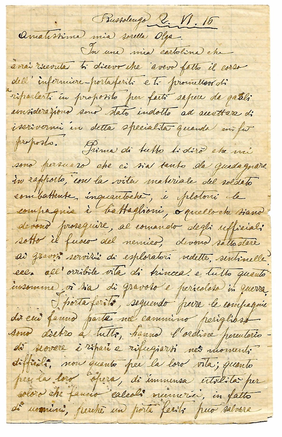 In una mia cartolina che avrai ricevuta ti dicevo che avevo fatto il corso dell’infermiere-portaferiti e ti promettevo di riparlarti in proposito per farti sapere da quali considerazioni sono stato indotto ad accettare di iscrivermi in detta specialità quando mi fu proposto. Prima di tutto ti dirò che mi sono persuaso che ci sia tanto da guadagnare in rapporto con la vita materiale del soldato combattente inquantochè i plotoni, le compagnie, i battaglioni, o quello che siano, devono proseguire, al comando degli ufficiali sotto il fuoco del nemico, devono sottostare ai gravosi servizi di esploratori vedette, sentinelle, ecc all’orribile vita di trincea e tutto quanto insomma vi sia di gravoso e pericoloso in guerra.