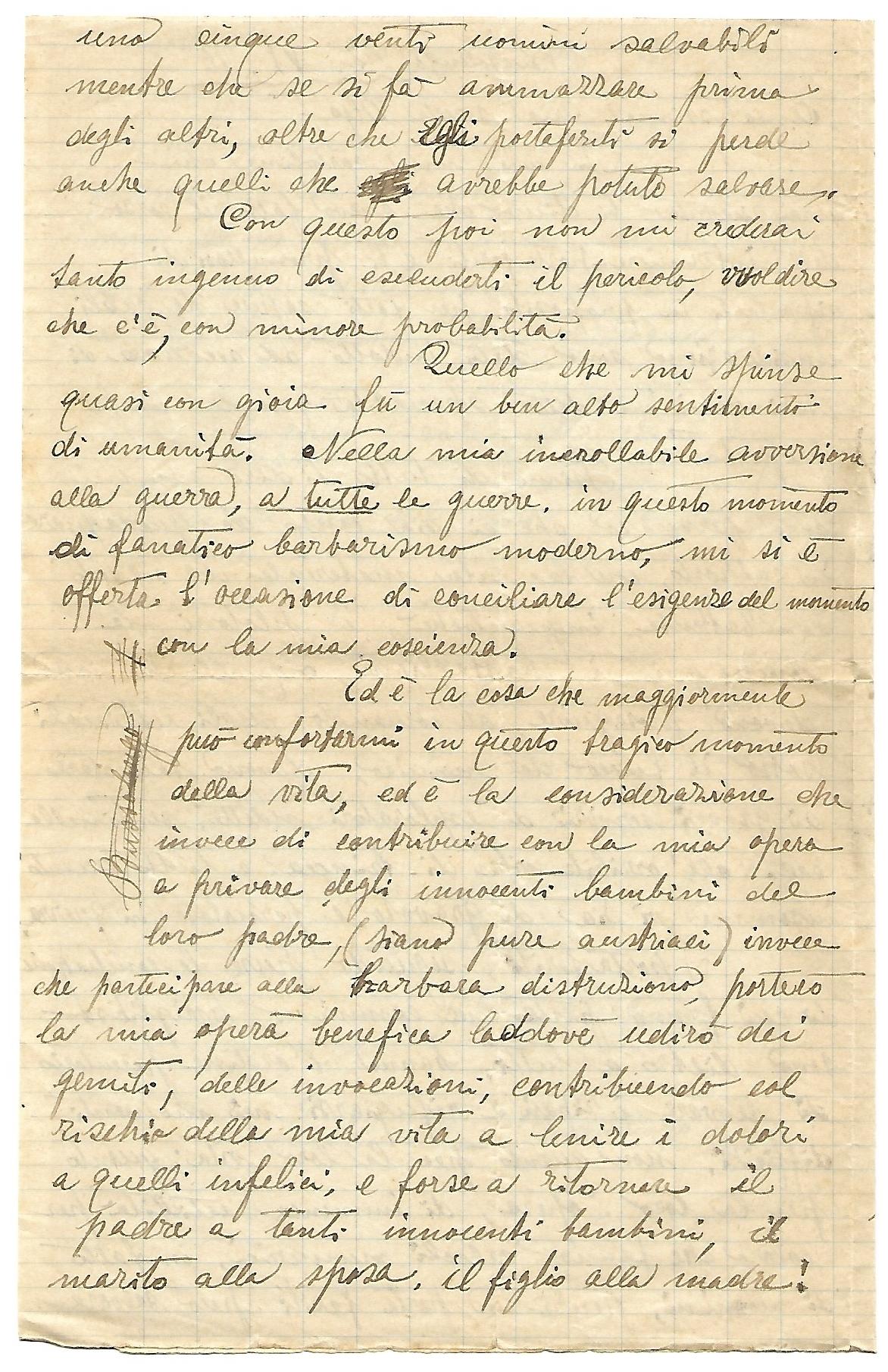 Quello che mi spinse quasi con gioia fu un ben alto sentimento di umanità. Nella mia incontrollabile avversione alla guerra, a tutte le guerre, in questo momento di fanatico barbarismo moderno, mi si è offerta l’occasione di conciliare l’esigenza del momento con la mia coscienza.Ed è la cosa che maggiormente può confortarmi in questo tragico momento della vita, ed è la considerazione che invece di contribuire con la mia opera a privare degli innocenti bambini del loro padre (siano pure austriaci) invece che partecipare alla barbara distruzione porterò la mia opera benefica laddove udirò dei gemiti, delle invocazioni, contribuendo col rischio della mia vita a lenire i dolori a quelli infelici, e forse a ritornare il padre a tanti innocenti bambini, il marito alla sposa, il figlio alla madre.